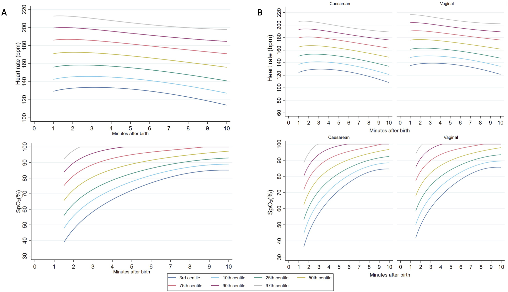 Even thinking about how to do such a study makes my head hurt, you need to enrol mothers at increased risk of needing neonatal resuscitation, and then randomize the babies who do actually need resuscitation to either have the usual approach (immediate clamping) or to have initial steps of resuscitation, at least attempts to establish pulmonary ventilation, with the cord intact. But very few babies who are at risk actually need positive pressure ventilation, so you have to put in place the resources required in order to screen nearly 1000 babies, enrol about 500, and finally randomize only 120 of them, as they did in this trial. Those enrolled but not randomized are babies who have delayed clamping and don’t need assisted ventilation. So the team had the great idea of collecting saturation and heart rate data from them in order to update the percentiles for normal transition, using data from infants with delayed clamping. The percentiles we all currently use are from babies with immediate clamping.