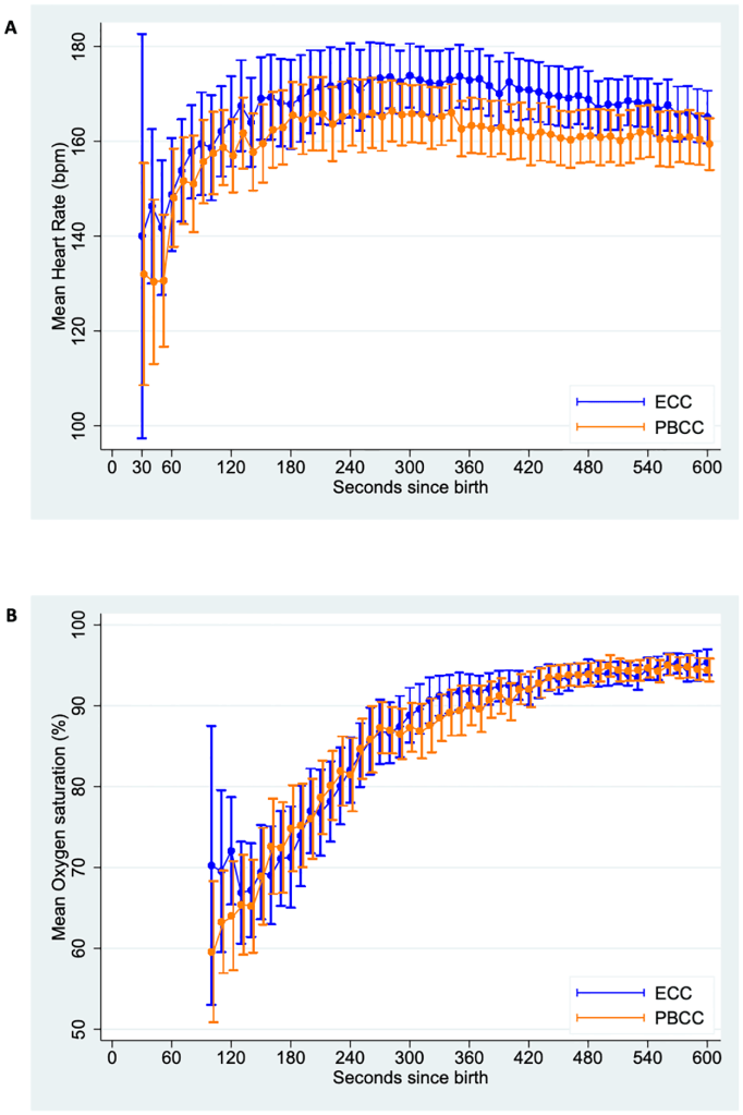 The primary outcome was not different between groups, or between subgroups, and the numerous secondary outcomes were also all similar. A few of the ECC babies started breathing very quickly after randomization, either before the cord was actually clamped, or within a few seconds afterwards, and the actual heart rates were almost identical during the intervention period, and then were slightly higher in the ECC group than the PBCC.