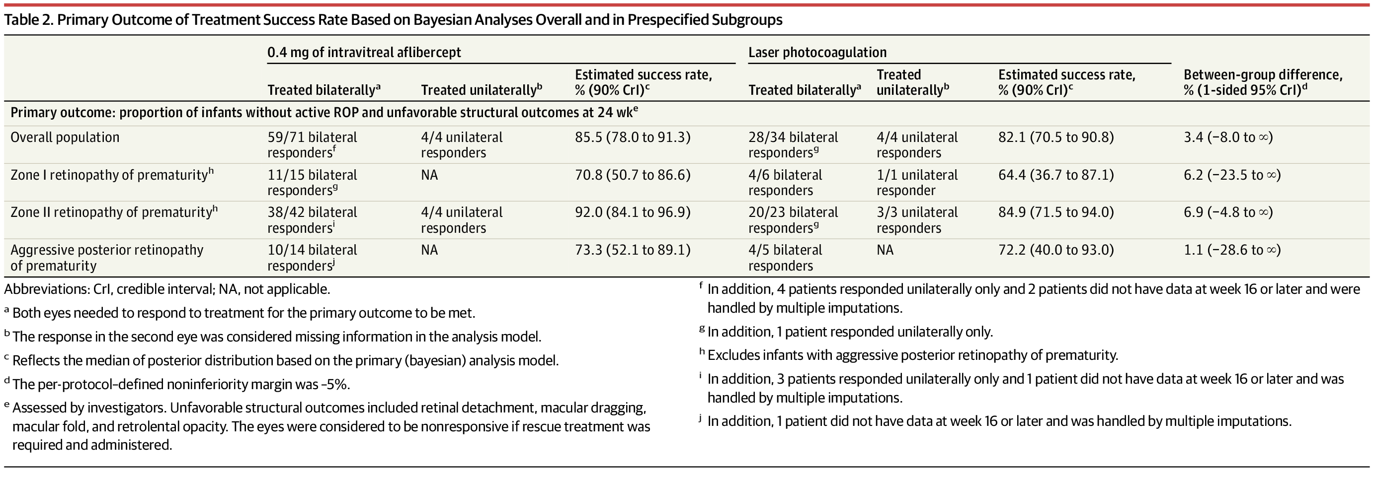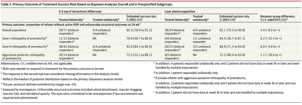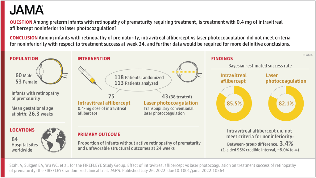The newly published article (Stahl A, et al. Effect of Intravitreal Aflibercept vs Laser Photocoagulation on Treatment Success of Retinopathy of Prematurity: The FIREFLEYE Randomized Clinical Trial. JAMA. 2022;328(4):348-59) is a randomized trial with a 2:1 randomization ratio, which enrolled 118 babies with retinopathy needing intervention (zone I stage 1+, zone I stage 2+, zone I stage 3, zone I stage 3+, zone II stage 2+, zone II stage 3+, or aggressive posterior RoP). The study was designed as a non-inferiority trial, with the primary outcome being treatment failure. If either eye had active RoP at 24 weeks post treatment, or either eye had retinal detachment (or another structural adverse outcome) then the treatment was determined to be a failure. Of course, if only one eye was treated, then only one was evaluated for success/failure.