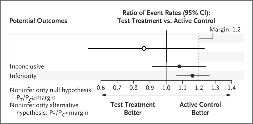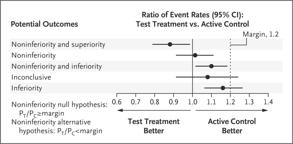 If you want to understand a bit more about non-inferiority trials, you could do worse than watch the NEJM youtube video (not words I thought I would ever write) . Or better still, read this article from the NEJM from a few years ago, which includes the following figure for interpretation of different possible results.