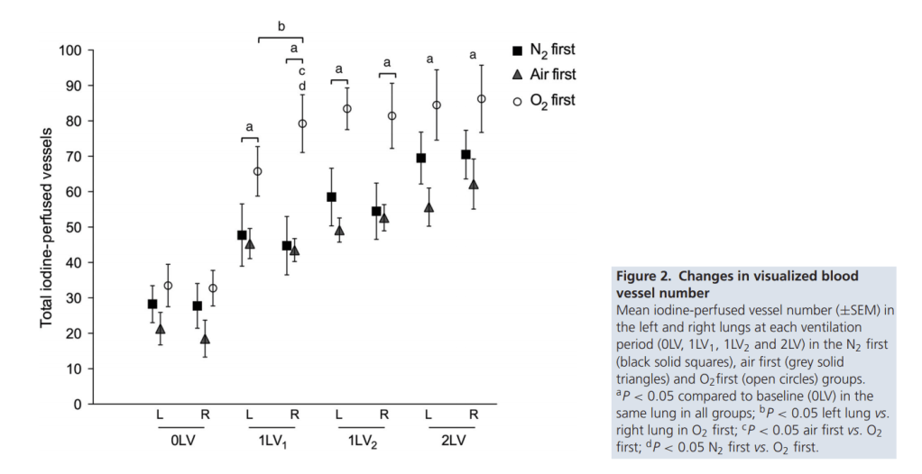 The fetal rabbit kits were ventilated unilaterally in the right lung with nitrogen or air or oxygen, then unilaterally with air (1LV2) then the tube was pulled back to ventilate both lungs with air. This is one selected image from the publication, showing the number of vessels that were seen in each lung, and that ventilating the right lung increased perfusion of both lungs, ventilating the right lung with oxygen increased perfusion further, especially of the right lung.