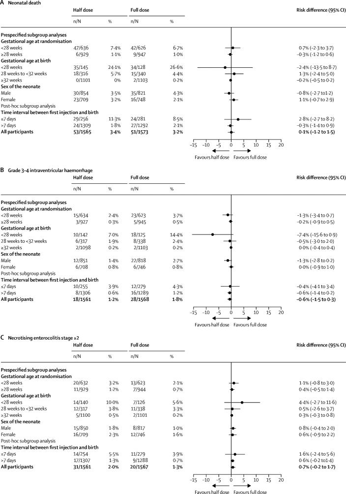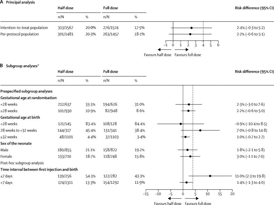 It looks like the lower dose is just about as good as the full dose, but, being stringent in our interpretation, they have not shown non-inferiority, the outcome was a little bit more frequent in the low dose dose group, and is consistent with a poorer efficacy. Of note there were only about 250 in each group that delivered within 7 days of receiving steroids.