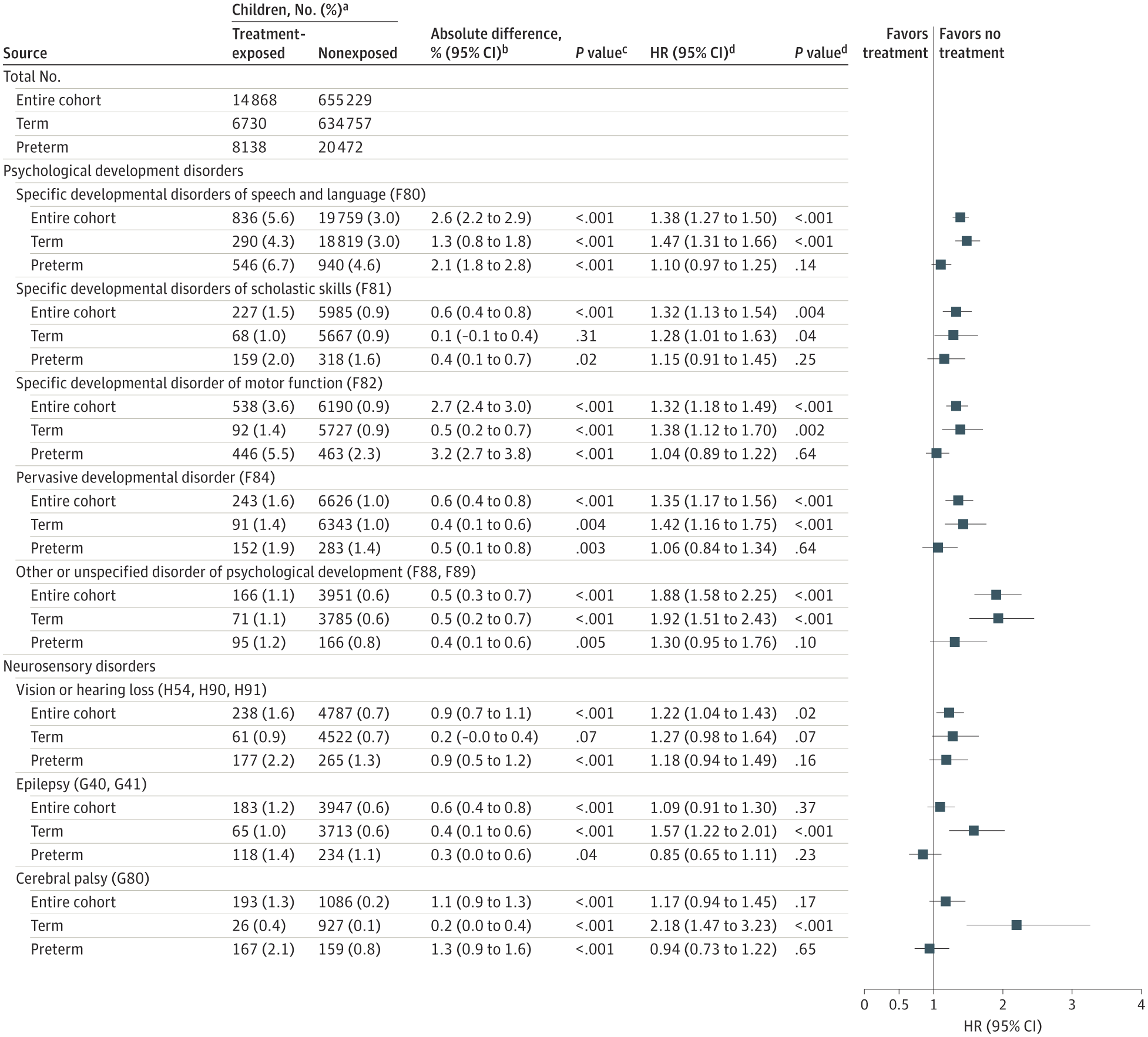 The absolute risks are small, however, for CP, for example, the Hazard Ratio is over 2, but the absolute percentages are 0.4 compared to 0.1.
