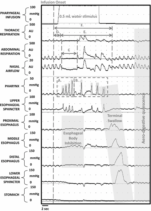 If you follow the alphabet, A the initial pharyngeal response was multiple pharyngeal contractions, during which time (C) respiration paused, and oesophageal activity ceased, then the baby took a breath, and more pharyngeal contractions (B) propelled the liquid to the oesphagus, where a peristaltic wave can be seen descending, as respiration has re-started.