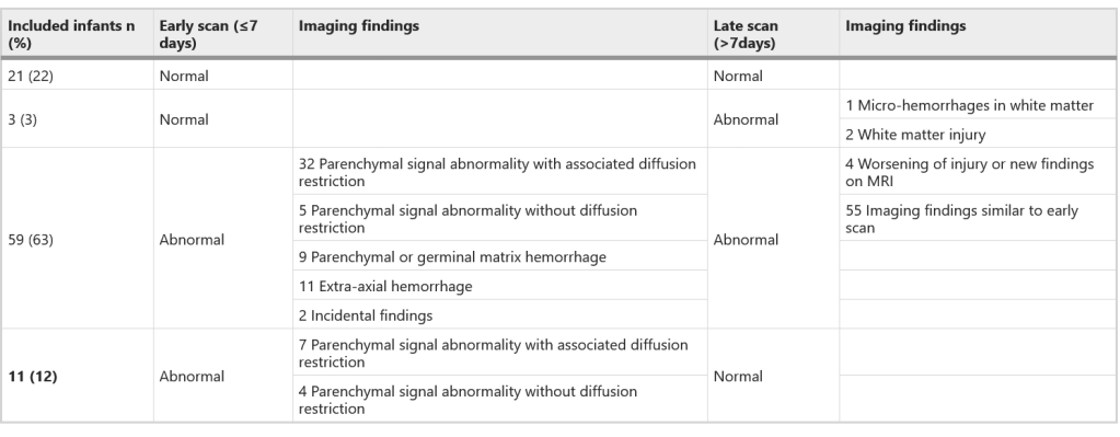 Garvey AA, et al. Differences between early and late MRI in infants with neonatal encephalopathy following therapeutic hypothermia. Pediatr Res. 2023. This is a review from Boston of the images and outcomes of 94 babies who had both early, <7 days, and late, >7 days, MRI. The early images were obtained at a median of 4 days (IQR 4-4, or in other words more than half of them on day 4) and the late ones at a median of 16 days (IQR 12- 25 days). The second scan was obtained in order to satisfy their protocol which was to have a 2nd scan at 10 to 21 days, and it seems most were obtained from babies who were still inpatients, there were a concurrent 156 babies who were cooled and only had one scan (2 died before, 148 were discharged before, and 4 transferred).