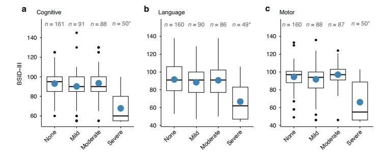 Wu YW, et al. How well does neonatal neuroimaging correlate with neurodevelopmental outcomes in infants with hypoxic-ischemic encephalopathy? Pediatr Res. 2023. This is an analysis of data collected during the HEAL trial, of erythropoietin in addition to cooling in term HIE (compared to cooling alone). As you probably remember, the trial had a negative result, with no additional benefit of erythropoietin. As all the babies had MRI, and all had neurological and developmental follow up the trial gives a real world evaluation of the predictive capacity of MR imaging in a multicenter prospective trial. All the babies had T1 and T2 and Diffusion Weighted images, and MR spectroscopy of left thalamus. The main outcome of interest, I think, is what is referred to as “severe NDI”, which seems to have been BSID cognitive score <70 or a severe motor outcome, which is defined in a unique way, with a modified GMFCS, but using a matrix determined by the GMFCS and a diagnosis of CP, and its type. So an infant with a clinical diagnosis of spastic tetraparesis is considered a severe outcome even if the GMFCS is 1. An infant with hemi- or di-plegia is considered severe at a GMFCS of 3.