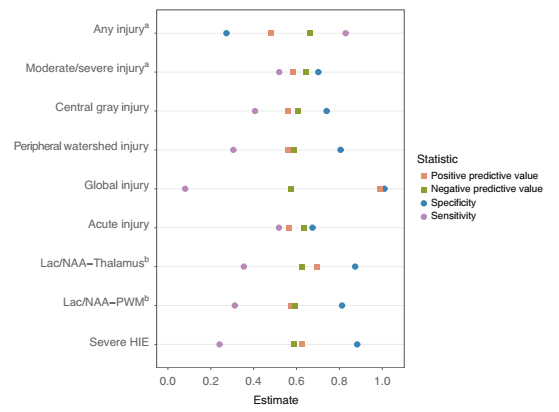 In this cohort who all had moderate or severe HIE, the PPV and NPV of almost all findings are poor. Clinical severity of the HIE is just as good as most findings on the MRI, apart from “Global Injury”. What I get from this is that the MRI score, and MRI severity of injury are quite poor at predicting medium term outcomes, but the pattern of injury, and specifically the presence of Global Injury (which is defined as damage affecting >75% of the brain, including Central Gray Matter, White Matter, and Cortex. Although not shown in this figure, in the text it states “with all 34 affected infants either dying or developing severe NDI”. The sensitivity for that finding is poor, as there were many infants with “NDI” who did not have global injury, and therefore the NPV is only around 50%, but the specificity and PPV are very high, and in this case, the outcomes are of major clinical importance.