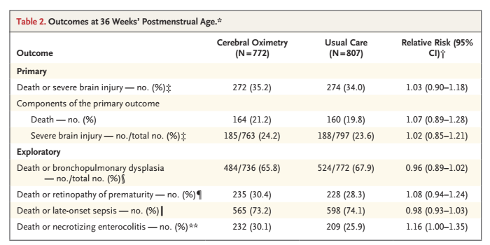 Previous randomized trials of routine cerebral NIRS in preterm infants have shown that cerebral hypoxia can be reduced by responding to the signal, but in an underpowered follow up of a subgroup, there was no impact on long term outcomes. The same investigators, in an expanded collaborative of 70 NICUs studied the impact of routine monitoring of cerebral oxygenation on brain injury as shown on ultrasound up to 36 weeks PMA. Hansen ML, Pellicer A, Hyttel-Sorensen S, Ergenekon E, Szczapa T, Hagmann C, et al. Cerebral Oximetry Monitoring in Extremely Preterm Infants. New England Journal of Medicine. 2023;388(16):1501-11.