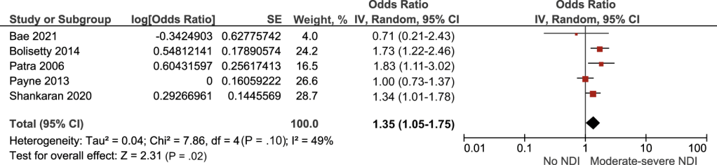 The plot shows the adjusted Odds Ratios for having what is labelled “moderate-severe NDI” is probably about 1.35. Which looks really bad.