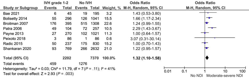 I submit that this information is of extremely limited value for counselling individual parents. Here is the Forest plot from a recent meta-analysis of the impacts of grade 1 and grade 2 hemorrhages (which is to say hemorrhages confined to the sub-ependymal region and/or blood within, but not distending, the ventricles)