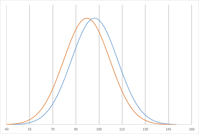The average BSID MDI score was about 97 for very preterm infants (<30 weeks) in the study included in the above systematic review from Nova Scotia (Radic et al) who did not have an IVH, and, if they are normally distributed, this gives the distribution of scores shown below as the blue line.
