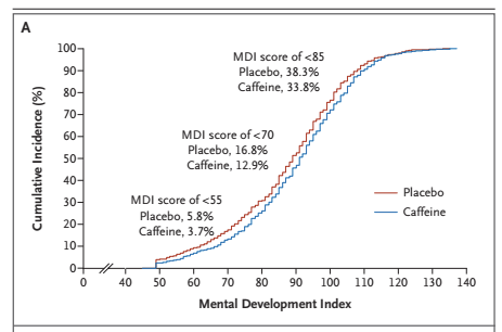 One could ask if the scores among former preterm babies are indeed normally distributed, and they probably are, with perhaps, in some cohorts, a slight skew at the bottom end. It is very hard to be sure, however, as the data are not usually given; even when the mean and SD of the scores are described, the actual distribution is very rarely shown. It is something which we did show in the report of the 2 year outcomes of the CAP trial, which showed a shift upwards of about 3 points of the mean BSID2 MDI score in the caffeine group compared to the controls. Below is the graph of the cumulative distribution of the scores. You can see, at the bottom of the curves, that they are truncated at 49, as the few untestable babies were all assigned a score of 49.