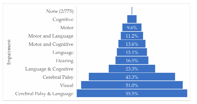 The scenarios were constructed in order to reflect what are considered to be “severe NDI”, some examples are below, the terms in parentheses were not shown to participants, who all received a randomly selected 5 scenarios from the 10 that were created, the first 4 of which are shown below, who had isolated problems, everyone also received the scenario of a child without any delay or impairment.