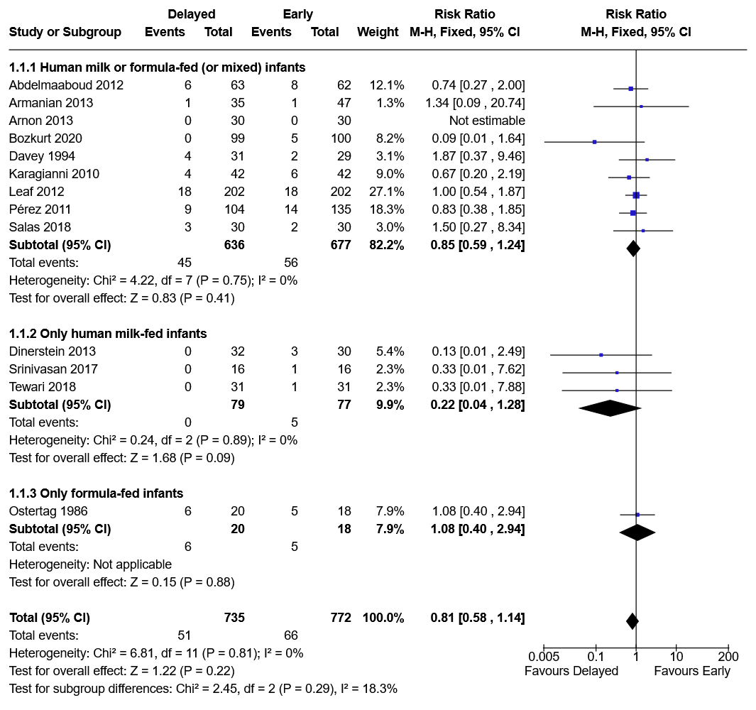 There are several trials that have investigated the impacts of starting feeds early, to starting them later, without a period of trophic feeds, in other words with an immediate start of feeding advancement. One of the best was limited to only very high risk babies, with SGA and abnormal antenatal dopplers. This was the ADEPT trial (Leaf 2012 in the figure below), which showed that the babies in either group had a lot of difficulty with feeding tolerance, but that there was no difference in outcomes of NEC, or survival, by group assignment (starting enteral feedings and immediate advancement at 2 days compared to at 6 days.) The Cochrane review showed no impact of delayed progressive feeds, compared to early progressive feeds, the Forest plot below is for the outcome stage 2 NEC, and shows that earlier feeding does NOT increase NEC.