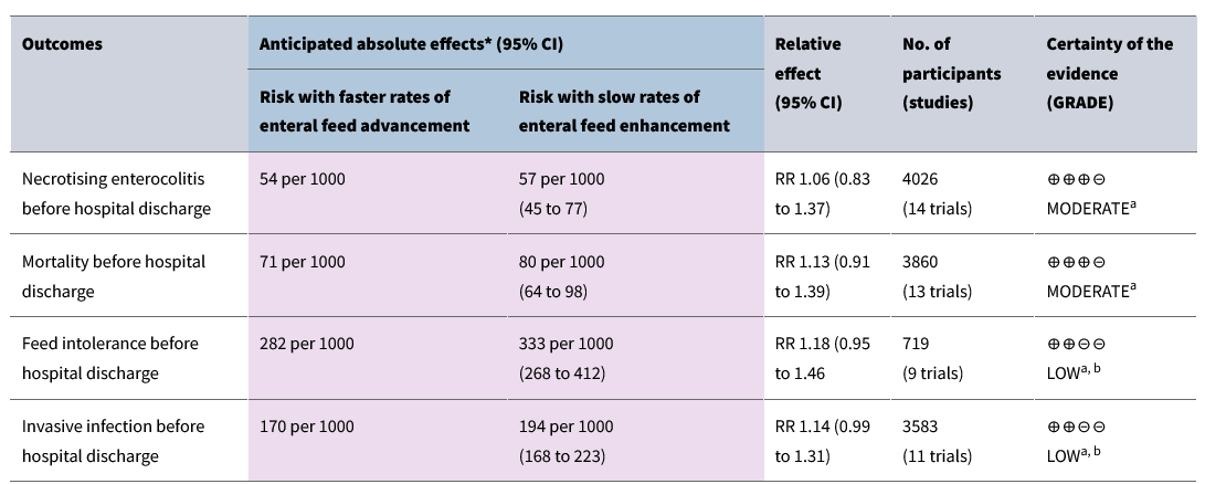 Once you start feeds, then the rate of increase has NO impact on NEC from any of the randomized trials. That is the other very misleading statement in this new review, the figure and the text suggest that slower feeding advancement leads to “possibly less risk for NEC” and “less risk for feeding intolerance”. Neither statement is supported by the literature.