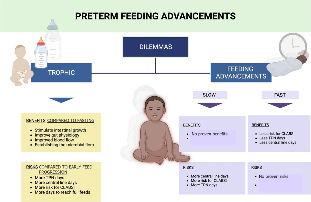 There is no evidence that prolonged fasting, several days of trophic feeds, or slower advancement of feeds have any benefit in terms of NEC or feeding intolerance. Arriving at full feeds more slowly, however, does increase the duration of TPN, and all the associated complications, including late-onset sepsis (although, to be as stringently evidence-based as possible, the evidence for a reduction in LOS with more rapid advancement is uncertain).
