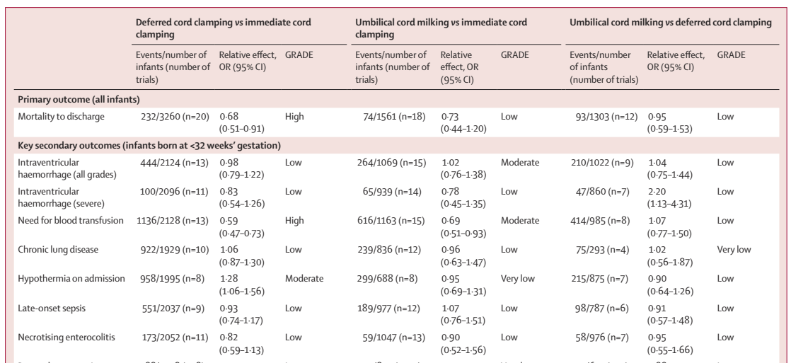 The second paper tries to evaluate the data regarding how long to delay cord clamping (Seidler AL, et al. Short, medium, and long deferral of umbilical cord clamping compared with umbilical cord milking and immediate clamping at preterm birth: a systematic review and network meta-analysis with individual participant data. Lancet. 2023), dividing the studies up into 3 groups, 15 to 45 seconds, 45 seconds to less than 120 seconds, and 120 seconds or more. Almost all of the information for the longest delayed group comes from the same UK CORD pilot trial, the other trials with longer delays had more predominantly mature infants, and therefore few events. In particular there were very few severe IVH, so they don’t even report that, in the UK trial there were 6 and 7 severe IVH in the two groups, and the other trials had tiny numbers of babies at risk, or excluded the most immature, or had 0 events.