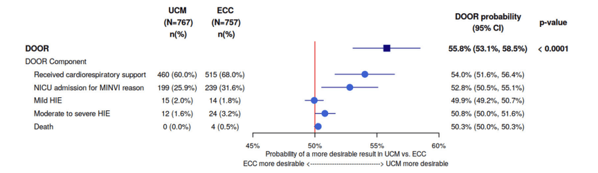 The DOOR analysis entails a calculation of how likely it is that a member of the UCM group will have a better outcome than a member of the ECC group. If the interventions are equivalent, then the possibility will be 50%, 95% confidence intervals can be calculated, and if they do not include 50%, then you can conclude, with 95% confidence, that the results are different. You can see in the figure below that the overall DOOR ranking was more likely to favour ECM, with the percentage of the comparisons between UCM and ECC babies favouring UCM being 56%, with 95% CI of 53 to 59%, and each component of the score favouring UCM, except for mild HIE being equivalent.