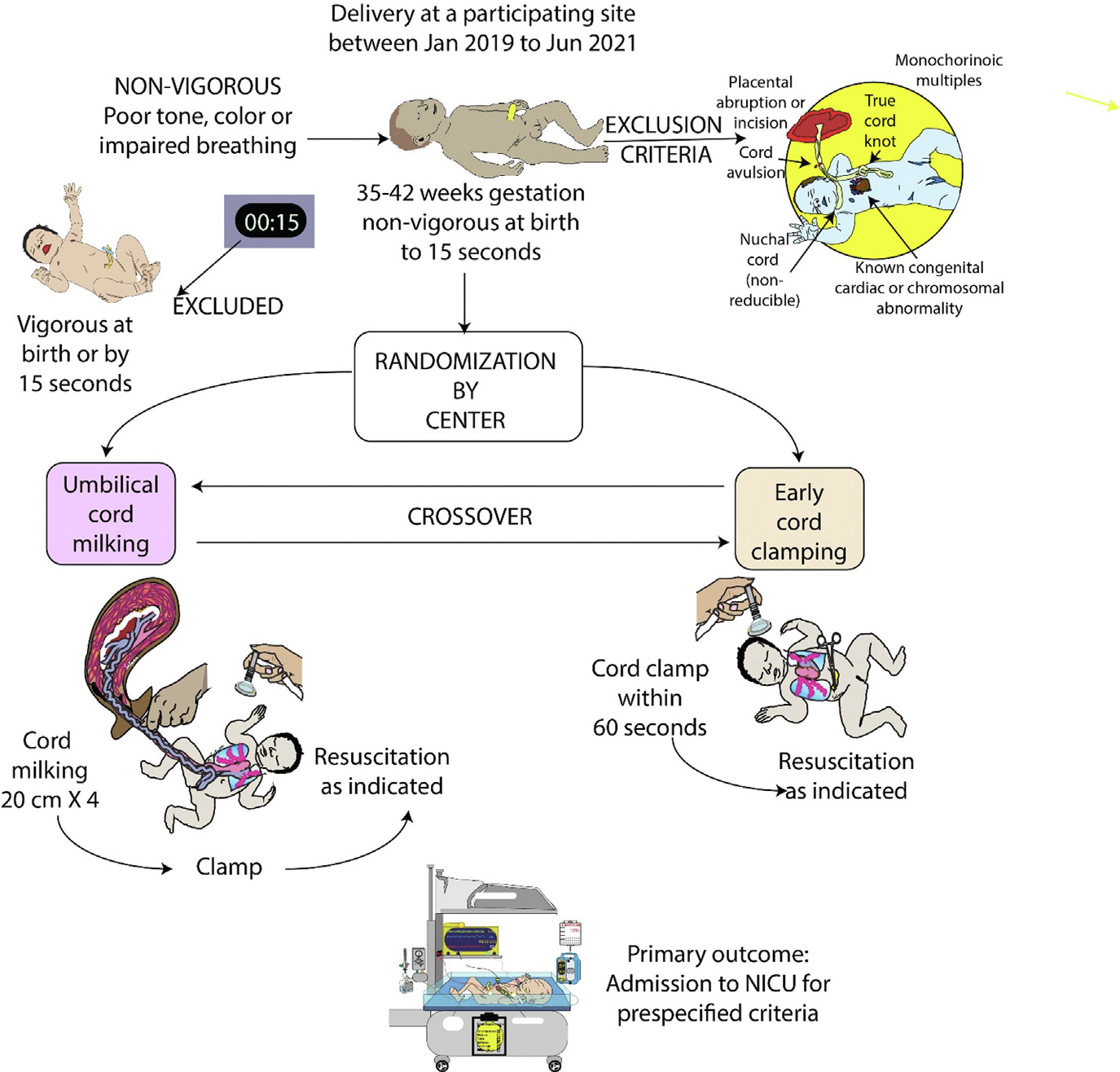 As usual, Anup Katheria is ahead of the game, and he has just published a reanalysis of the MINVI trial. This was a cluster randomized trial of cord-milking in term and near-term babies who were non-vigorous at 15 seconds of life. A cartoon of the protocol, from the original publication (Katheria AC, et al. Umbilical cord milking in non-vigorous infants: A cluster-randomized crossover trial. Am J Obstet Gynecol. 2022) is reproduced below.