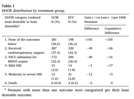 This reanalysis (Katheria AC, et al. Application of desirability of outcome ranking to the milking in non-vigorous infants trial. Early Hum Dev. 2024;189:105928) used a DOOR approach. Which depends on a list of ranked outcomes which are shown below in the first column of the table; the table also shows the numbers and proportion of babies in each of the two groups, Umbilical Cord Milking (UCM) and Early Cord Clamping (ECC) who have that outcome as their worst outcome.