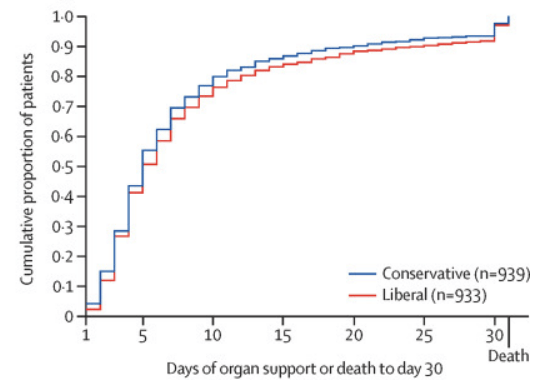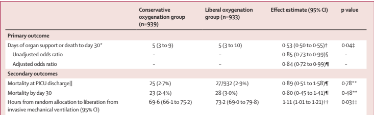 The size of the effect is expressed in a way which I find difficult to understand, it is “a probabilistic index of 0·53 (95% CI 0·50–0·55; p=0·04 Wilcoxon rank-sum test) indicating a higher probability for a better outcome in the conservative oxygenation group”.