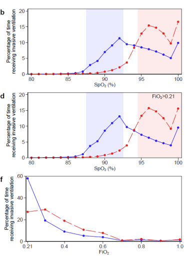 These 3 panels, using the same colours as the figure above, show the proportions of time by SpO2 in the top panel, the proportions of time with each SpO2 reading while receiving more than 21% oxygen in the middle panel, and the proportion of ventilated time with each FiO2 in the bottom panel. This is the version from the supplemental materials, which includes data up to day 30, data from the first 7 days are in the main article and look very similar. It looks like the lower SpO2 target group were extubated about 3 hours earlier on average, and may have had a shorter duration of cardiovascular support.