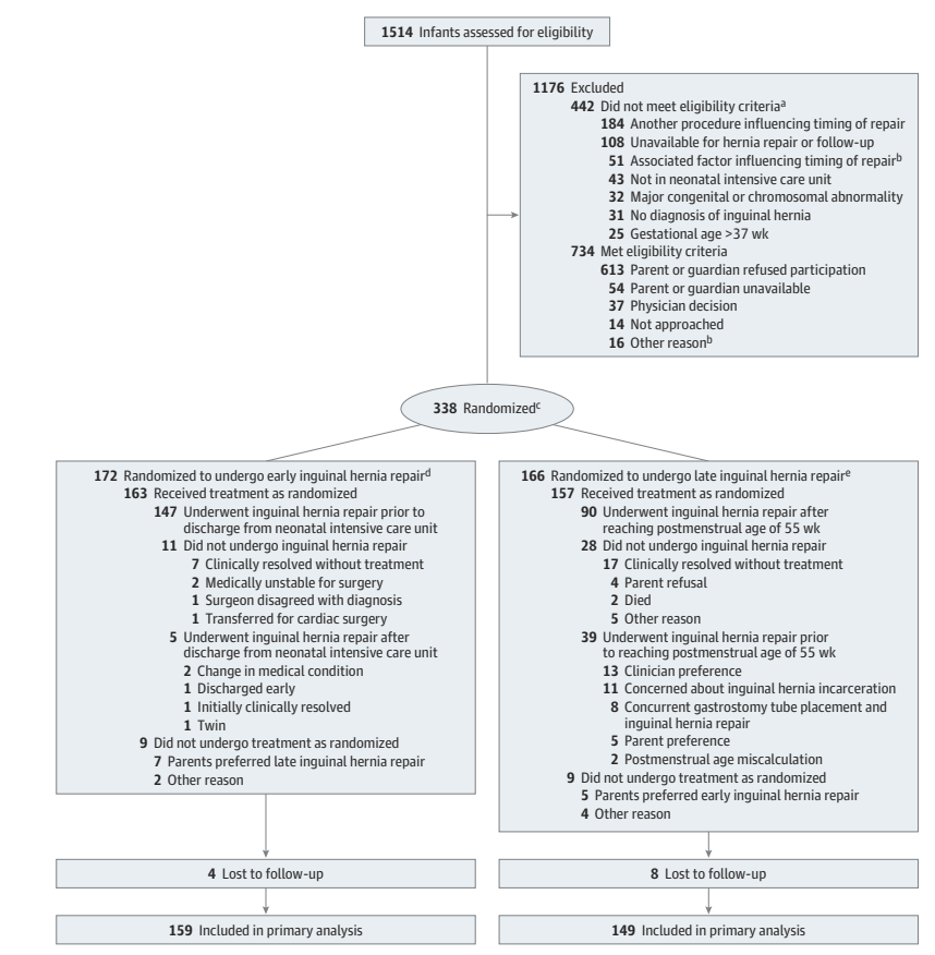 This pivotal multicentre RCT was performed to answer the practical question “is repairing an Inguinal Hernia in a former preterm infant safer if it is performed before discharge home from the NICU, or if done post-discharge at more than 55 weeks PMA?”(HIP Trial Investigators. Effect of Early vs Late Inguinal Hernia Repair on Serious Adverse Event Rates in Preterm Infants: A Randomized Clinical Trial. JAMA. 2024;331(12):1035-44)