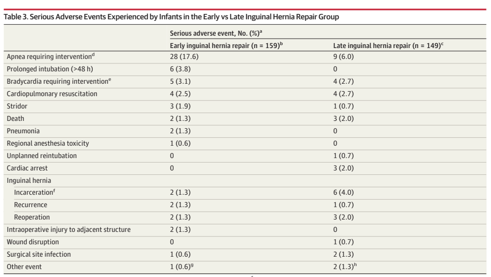 So the primary outcome was “safety” which was defined as the absence of any serious adverse event. These “included pulmonary events (apnea requiring intervention, prolonged intubation, unplanned reintubation, stridor, pneumonia), cardiac events (bradycardia requiring intervention, cardiopulmonary resuscitation, cardiac arrest), surgical events (intraoperative injury, wound disruption, surgical site infection), events related to the hernia (incarceration, recurrence, reoperation), and death”. Babies were eligible if born preterm (<37 weeks) and had an Inguinal Hernia. They were enrolled and randomized when thought to be 2 weeks from being discharged.