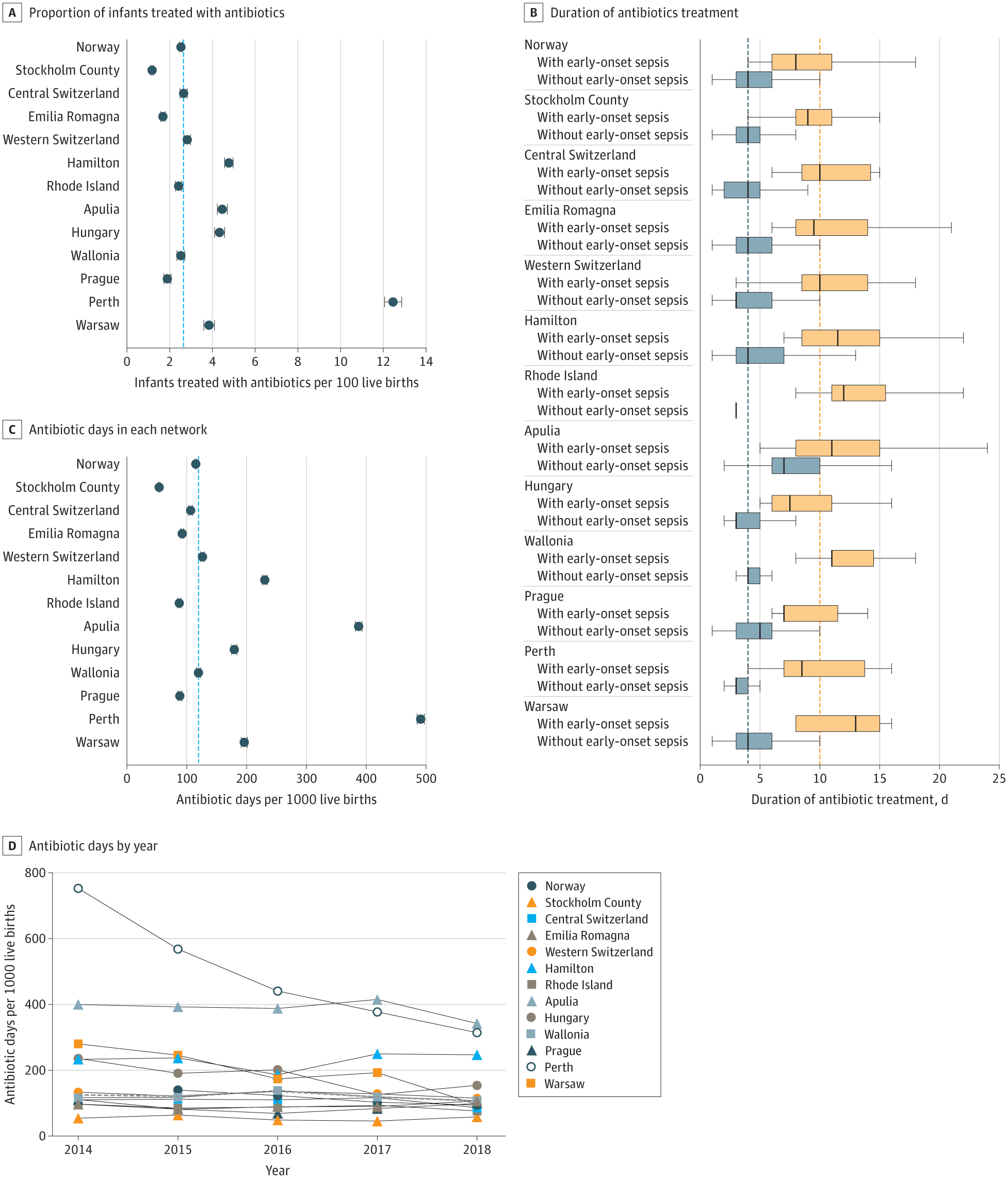 The first publication from the study (Giannoni E, et al. Analysis of Antibiotic Exposure and Early-Onset Neonatal Sepsis in Europe, North America, and Australia. JAMA Netw Open. 2022;5(11):e2243691) showed that 2.86% of the babies in the networks (total births over 750,000) received antibiotics, but the variability was enormous between networks, from 1.18% to over 12%.
