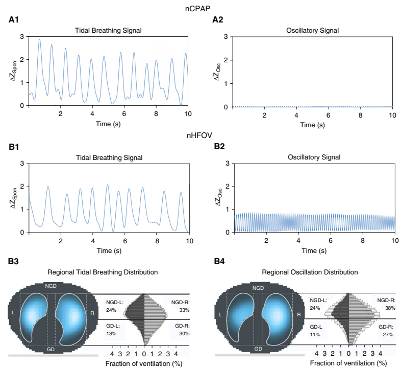 The figure shows the amplitudes of impedance changes over a period of CPAP compared to nHFOV, i the upper panels, and the lower coloured pictures show that the oscillations were preferentially transmitted to the right lung, especially the central and “upper” regions (the babies were in ventral positioning).