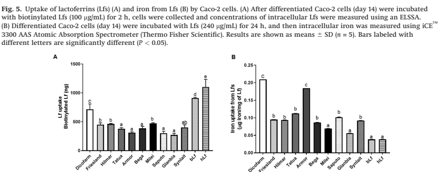 There are, however, known to be major differences in the biologic activity of different sources of bLF. One study examined 10 different bLF sources, and compared several different aspects of structure and activity between them, as well as their own bLF and human LF (Lonnerdal B, et al. Biological activities of commercial bovine lactoferrin sources. Biochem Cell Biol. 2021;99(1):35–46). There were major differences between bLF sources. As one example, they examined uptake of the LF by Caco-2 cells, and whether the LF transported iron into those cells