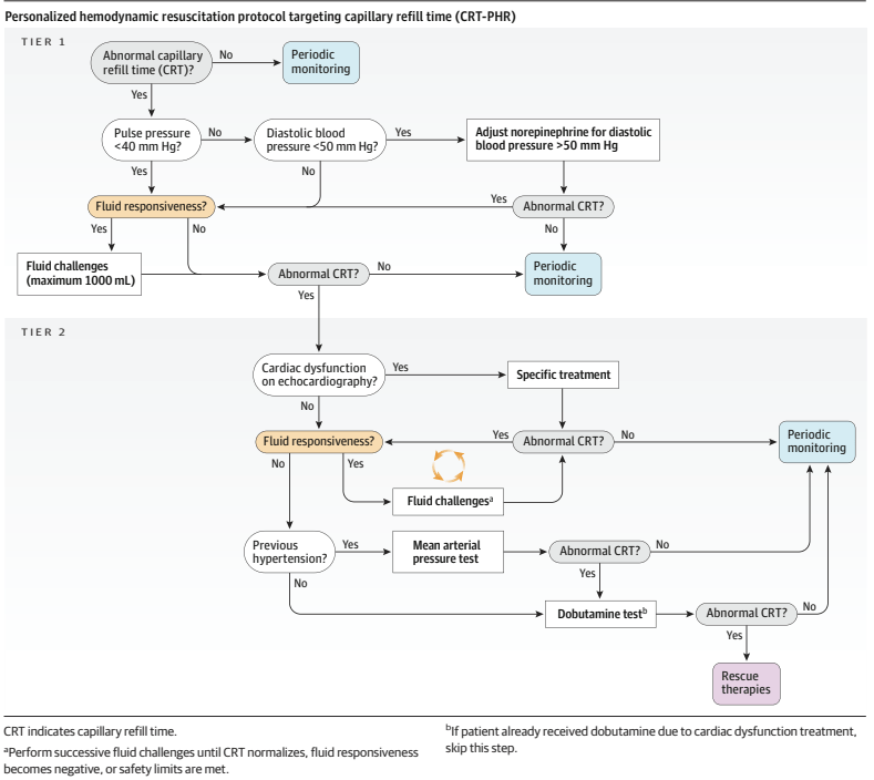 As you can see, if the CRT was >3 seconds, you first check the pulse pressure, and if it is >40 mmHg, then you check the diastolic BP, which may lead to increasing norepinephrine dose; the next stage may be to give more fluid to see if there is a response, and then progress to bedside echocardiography, which may lead to specific treatments, or more fluid, or eventually to low dose dobutamine.