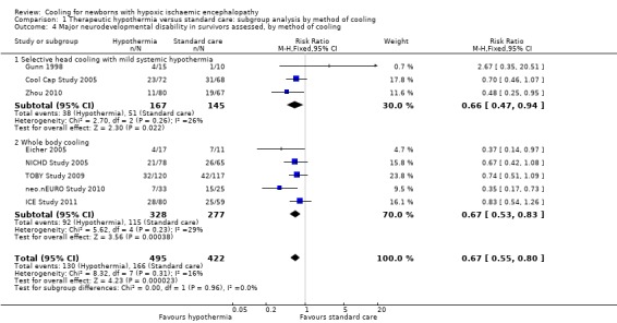 One of the numerous major advances in neonatology during my career has been the introduction of therapeutic hypothermia for infants with Hypoxic Ischemic Encephalopathy (HIE). Mortality is decreased, by about 25%, and long term morbidity among survivors is also decreased, by about 33%. Those estimates of effect size come from the Cochrane review, which provides the following Forest plot (I’m sorry about the quality of the image, the version in the pdf of the review is much clearer, but it extends over 2 pages, with a page break in the middle).