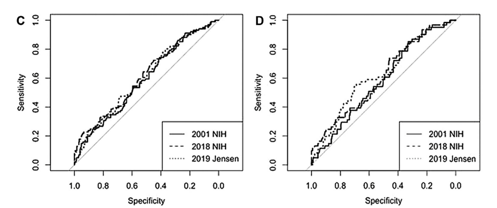 Graph “C” is the ROC for 2 year adverse respiratory outcome, and “D” for the 5 year outcome. The AUC (or C-statistic) were all between 0.55 and 0.58. Which is not much better than flipping a coin at 36 weeks! (AUC 0.5), and none of which were “statistically significant”. The ROC’s for Neurologic impairment or developmental delay were slightly better, but still mostly consistent with randomly predicting which baby would have difficulties.