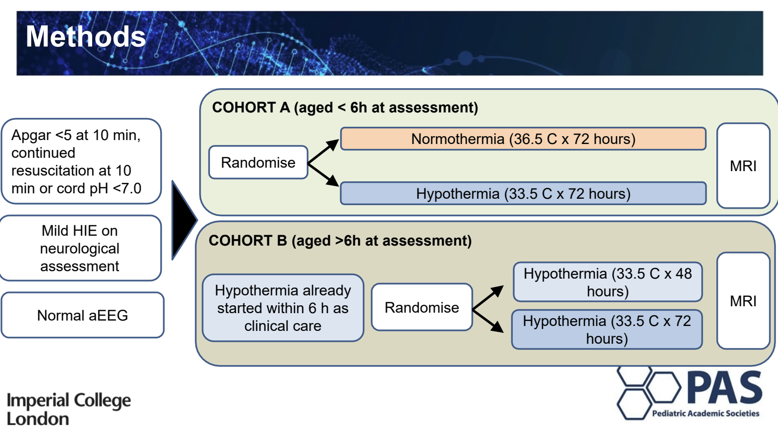 From Imperial College London a combined report of 2 trials targeting term babies with signs of mild encephalopathy. They had to have a clinical examination, in the mild category, and a normal aEEG. The trials includedonewith babies randomized before 6 hours, who were then treated with normothermia or standard hypothermia, and a second group of babies who were already cooled, and who were >6 hours of age, they were randomized to shorter or standard hypothermia.